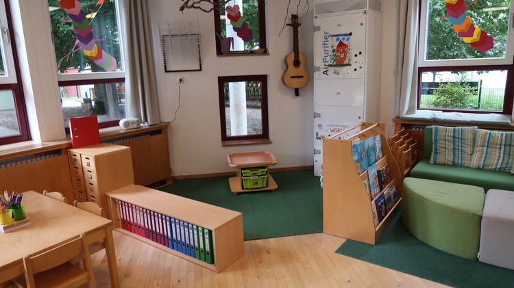 Im Obergeschoss befindet sich der Ruheraum, die Turnhalle, die Galerie als Spielbereich, das Atelier in dem auch die Vorschule stattfindet und die Küche für unser Mittagessen.